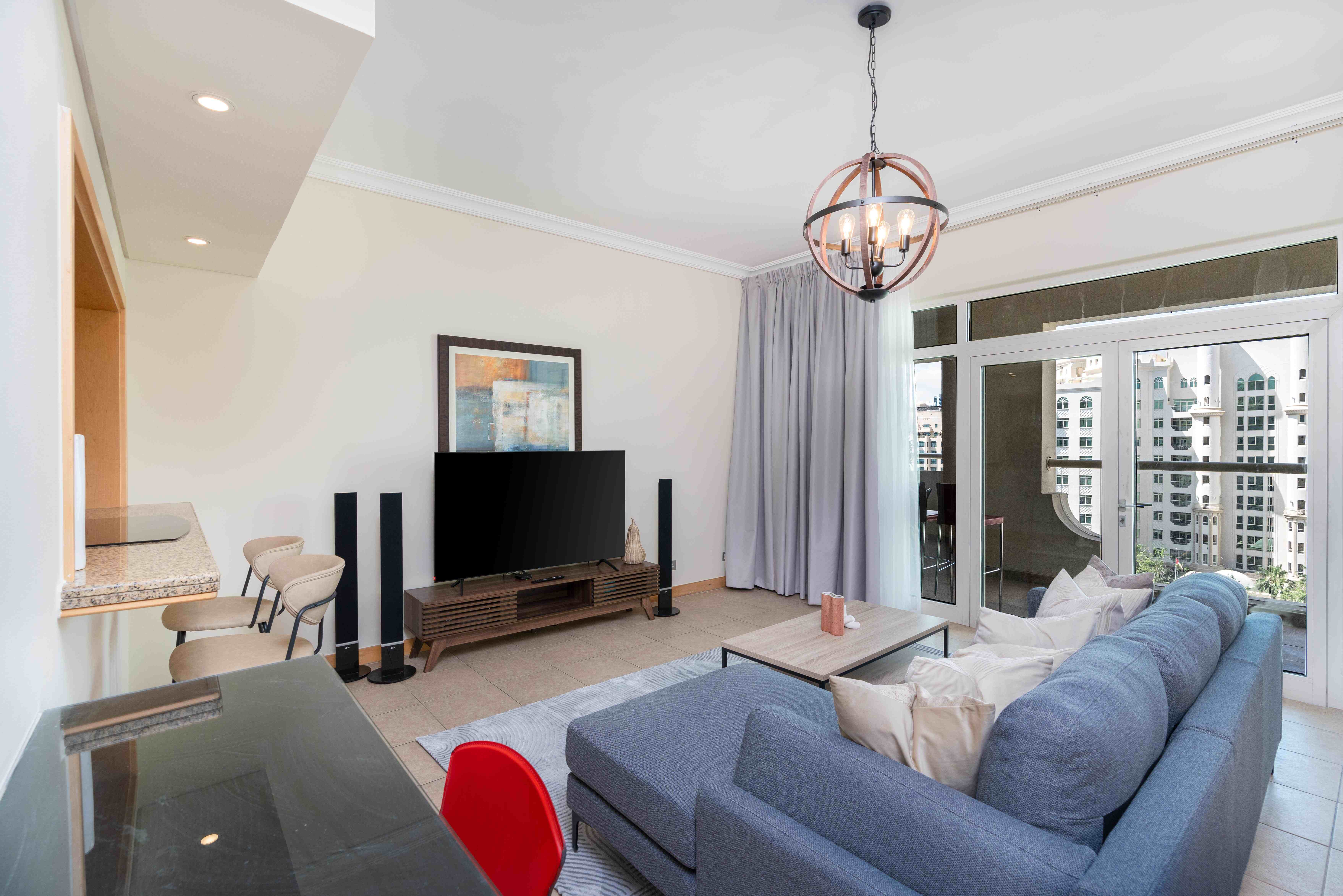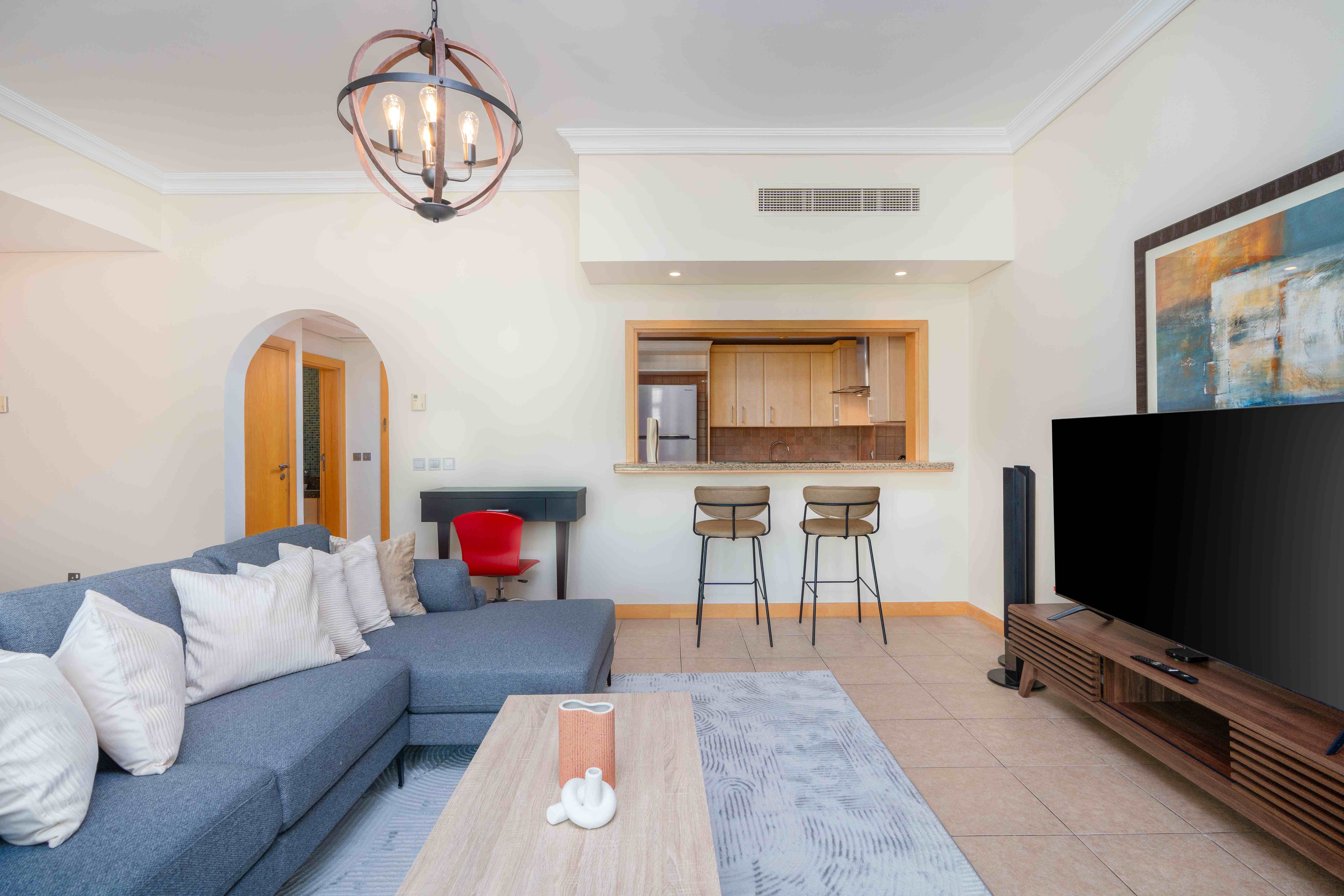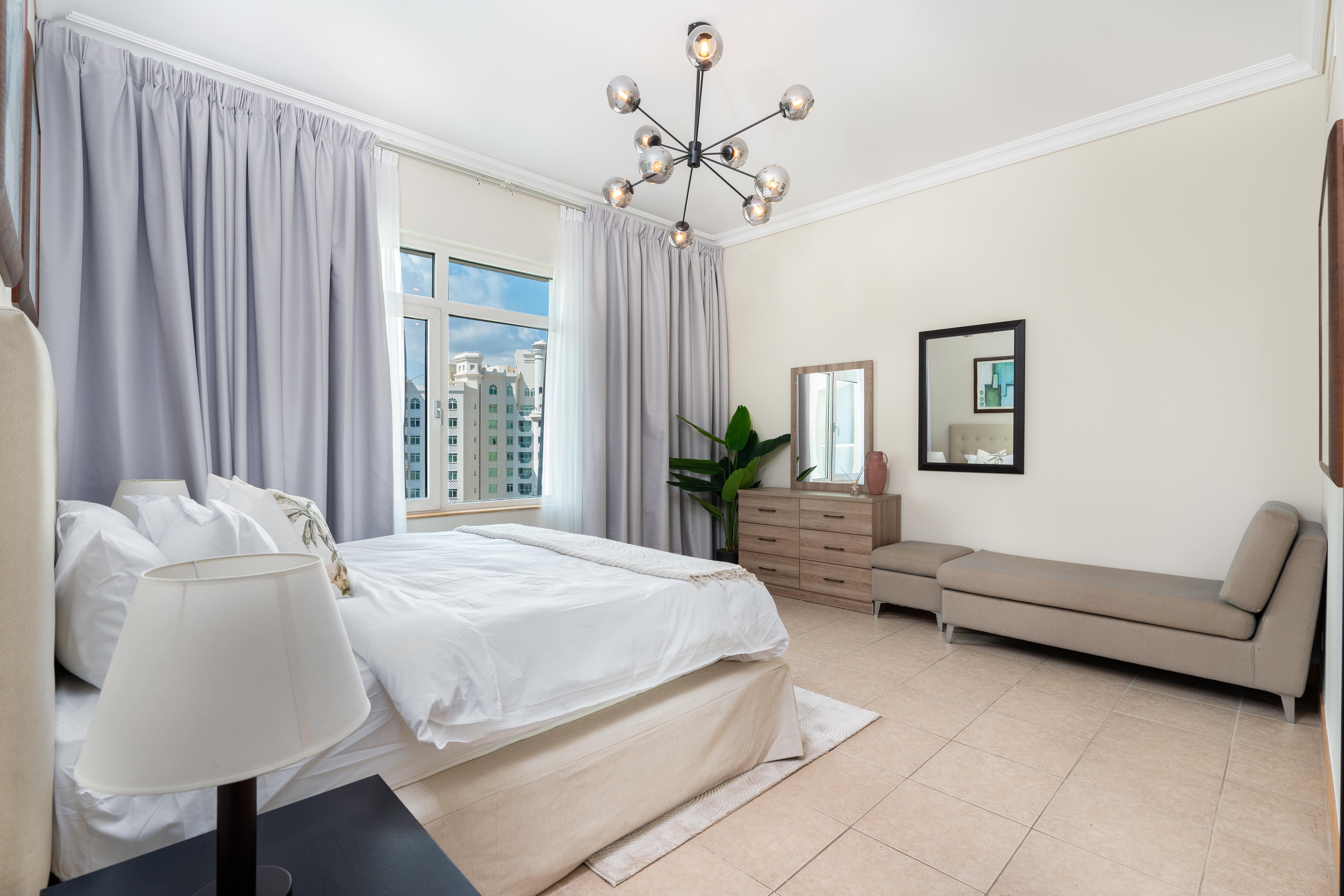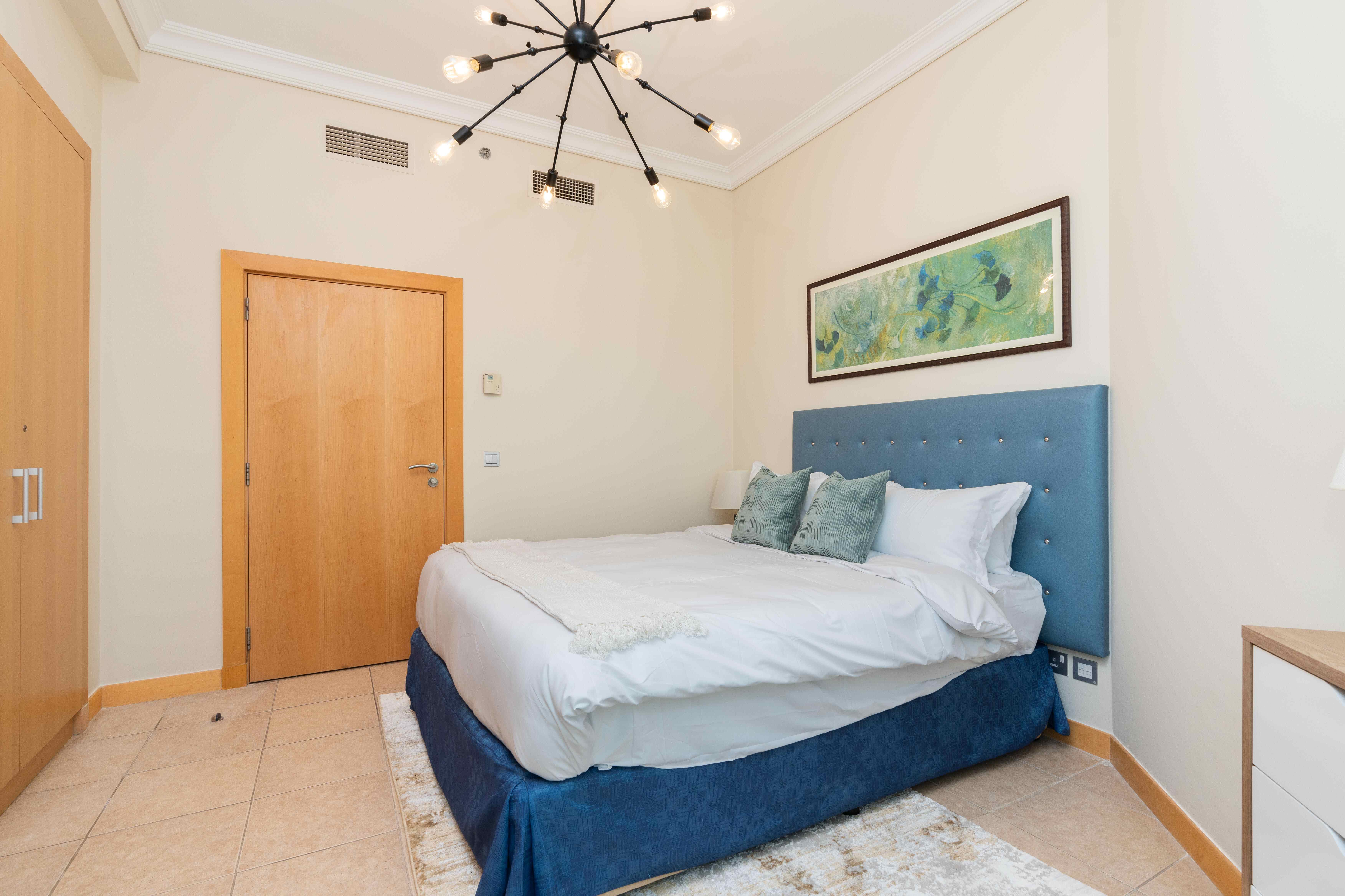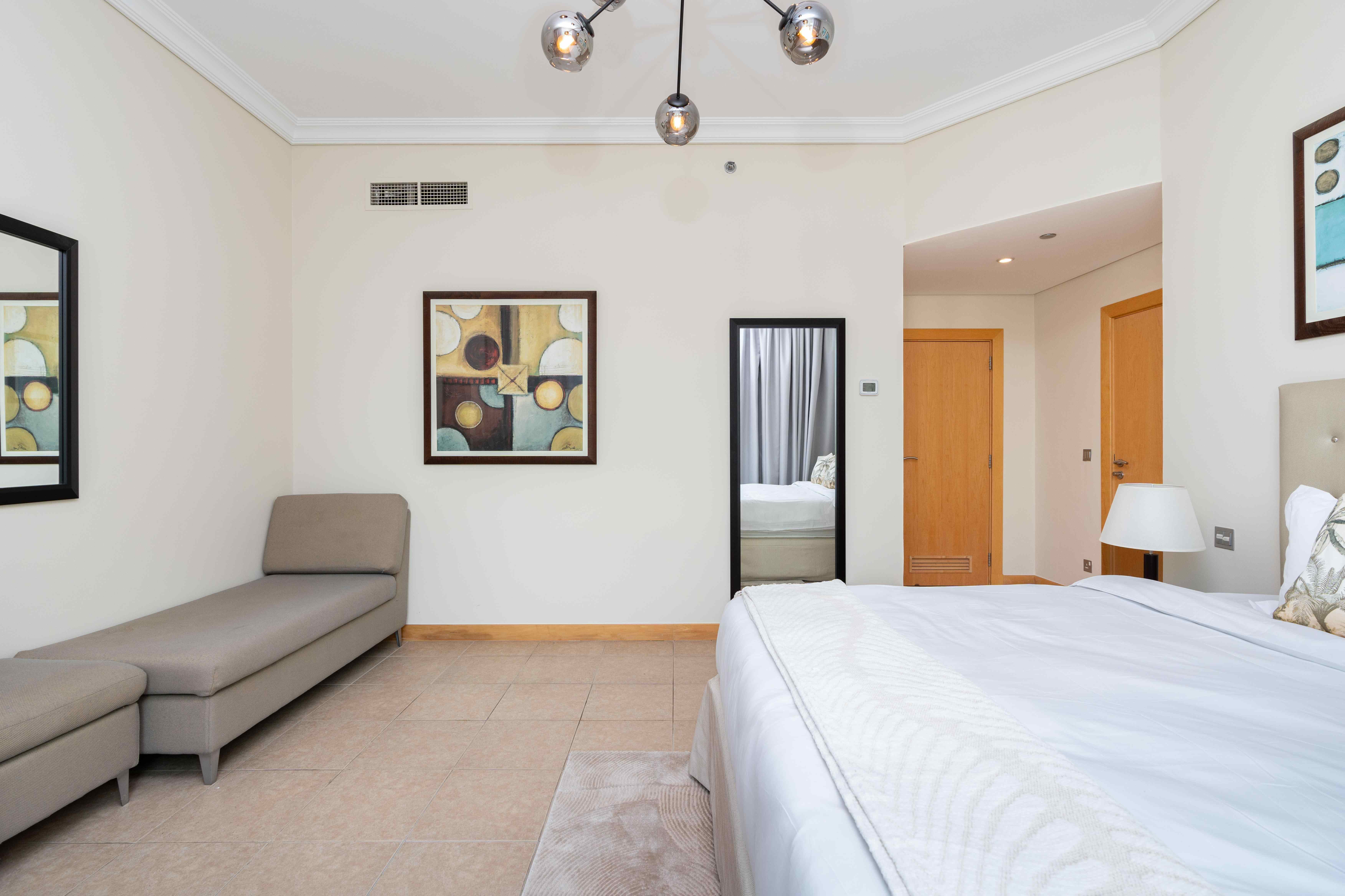 Situated in the heart of Palm Jumeirah, this delightful residence offers the best of both worlds - the vibrant city life and the breezy essence of a beachside retreat. This spacious one-bedroom apartment features a living and dining hall extending into the spacious balcony, the perfect spot to savor the coastal breeze and enjoy your morning coffee. The master bedroom with an ensuite bathroom comes with a king-size bed and TV to unwind and have a restful sleep.