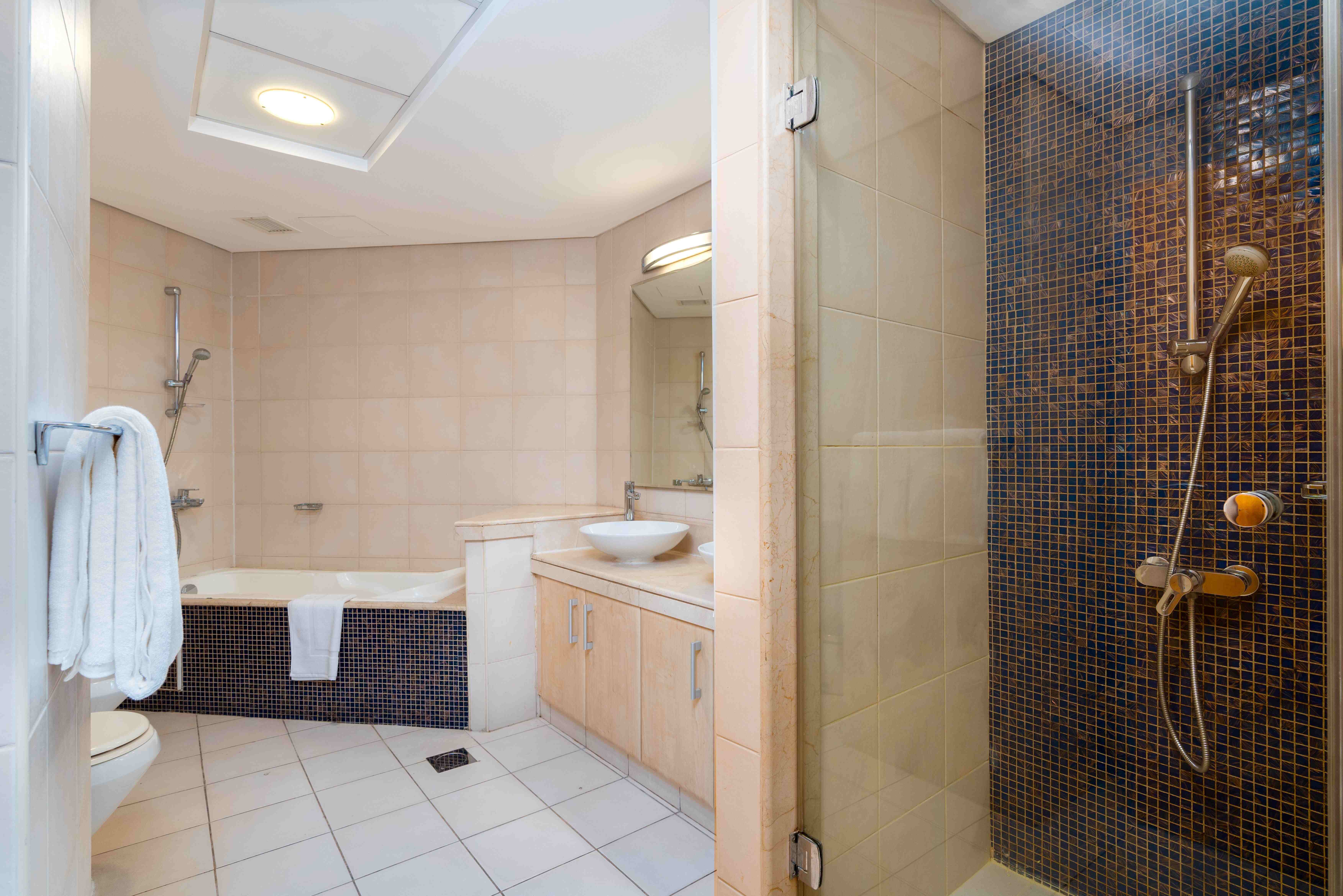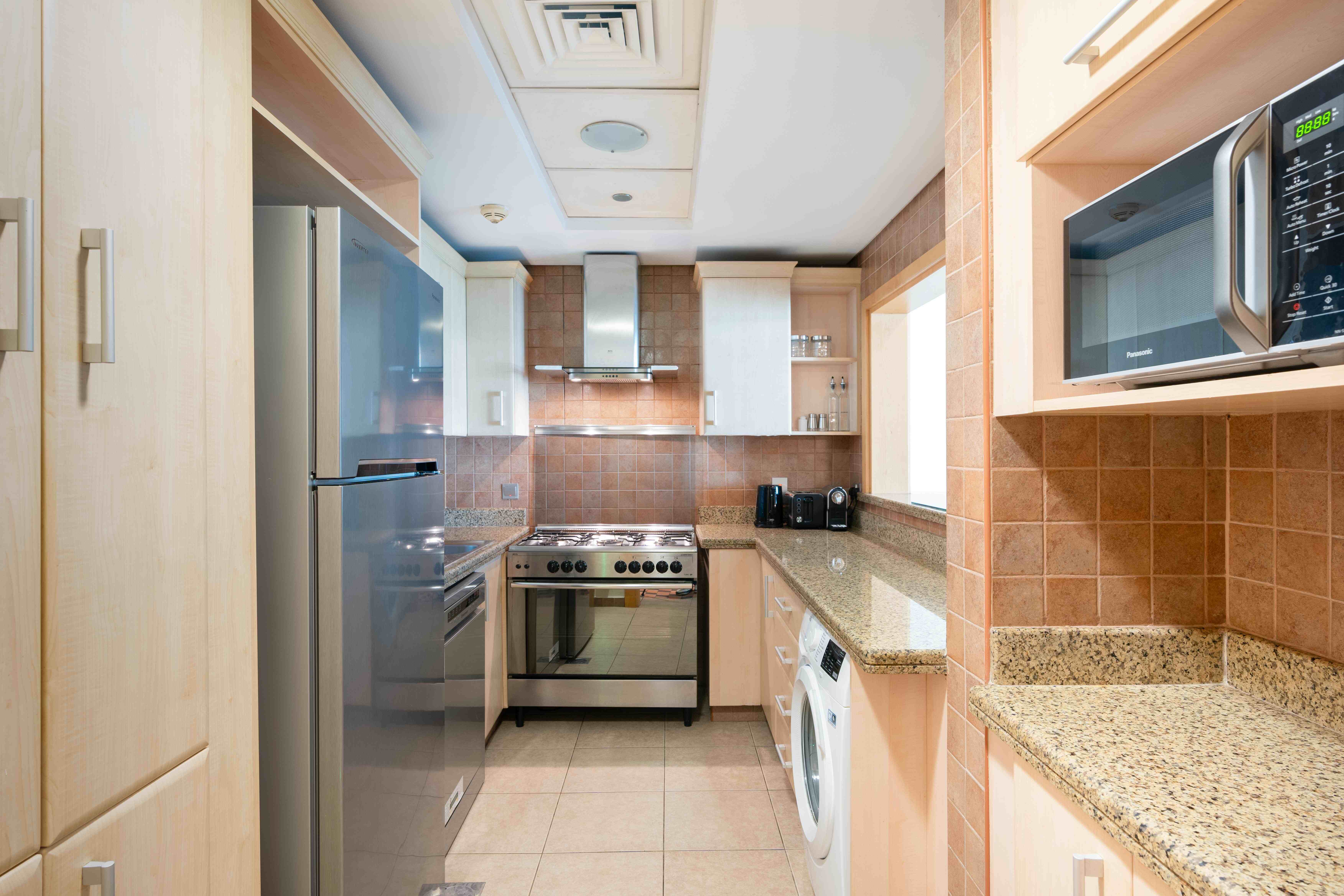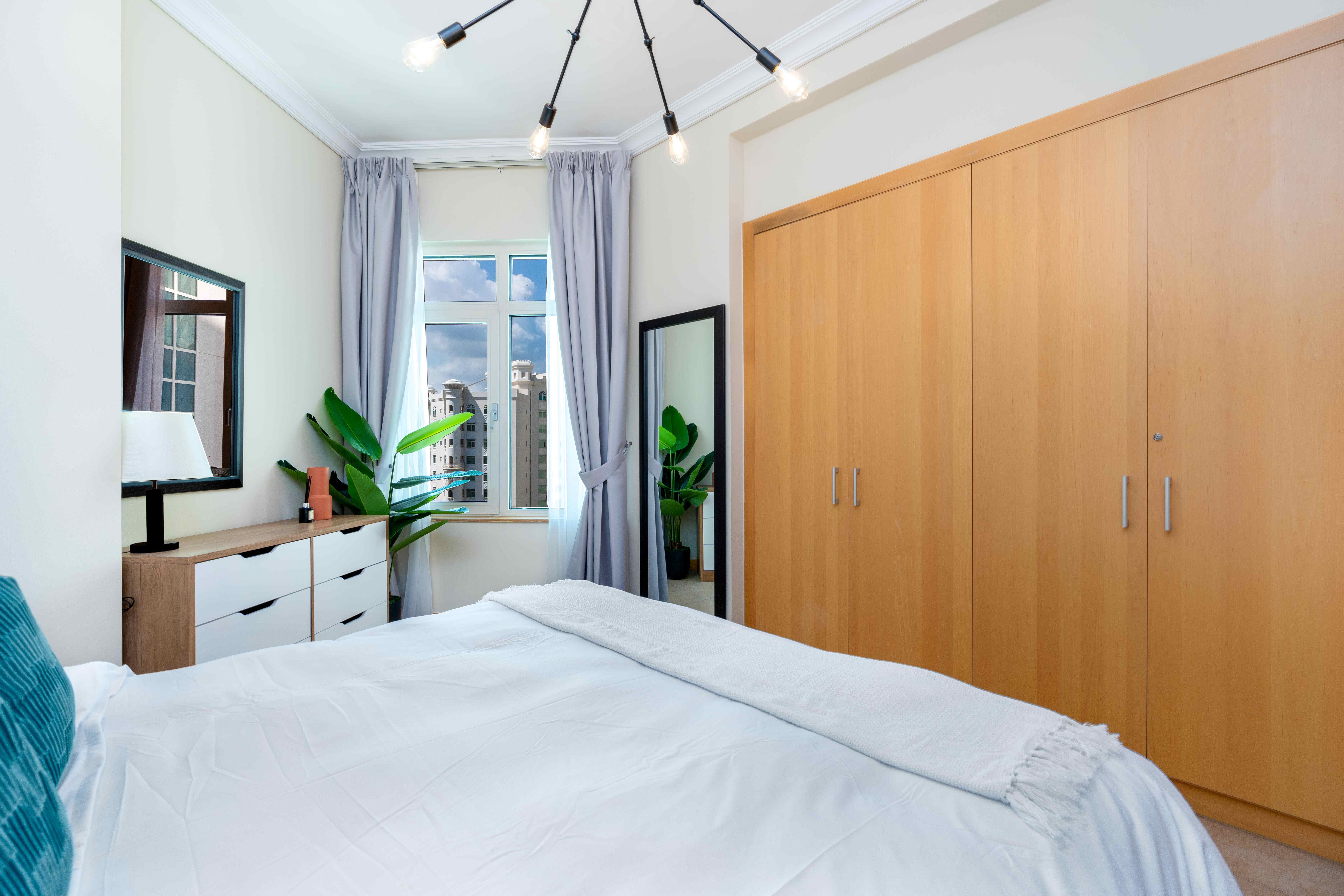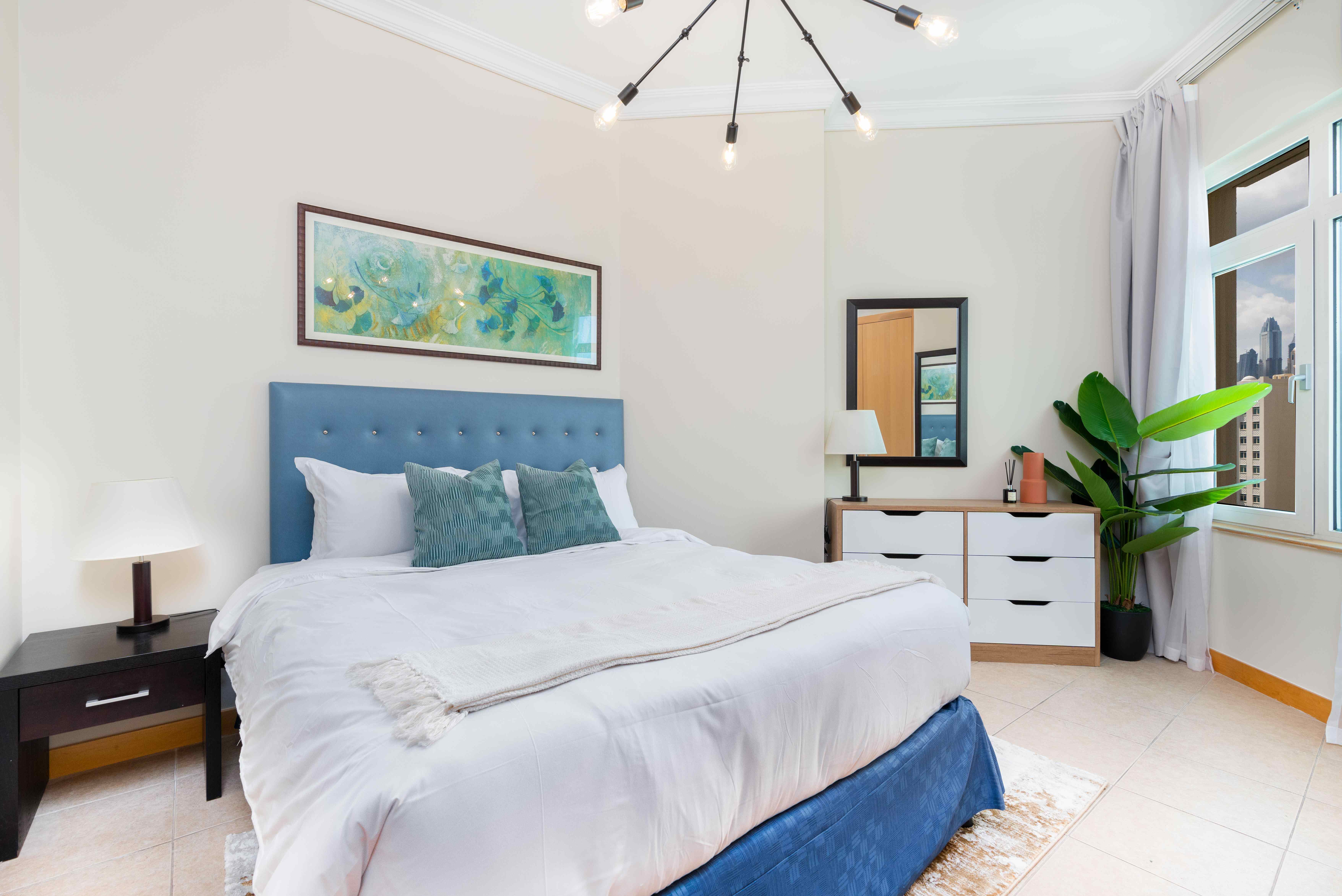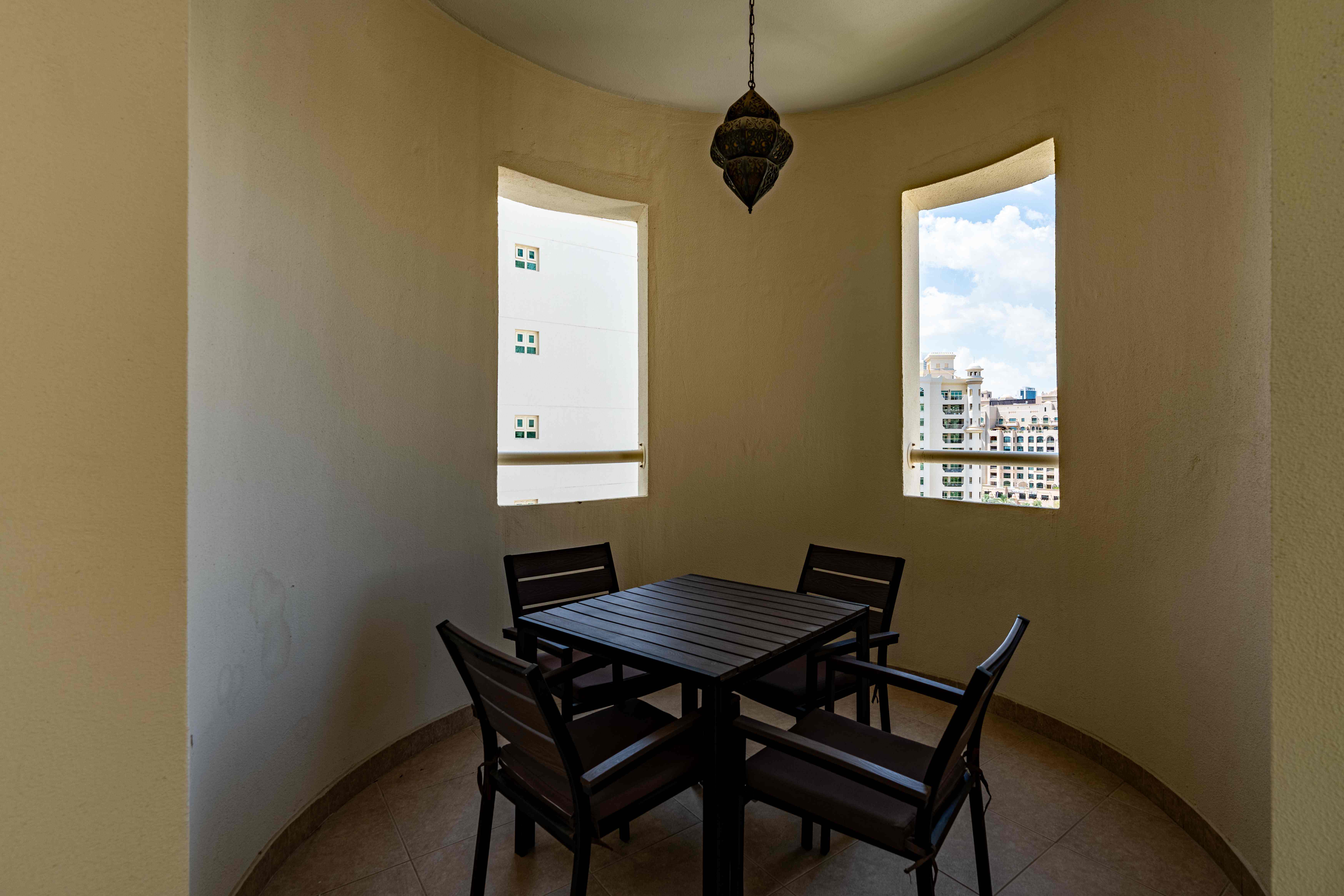 Situated in the heart of Palm Jumeirah, this delightful residence offers the best of both worlds - the vibrant city life and the breezy essence of a beachside retreat. This spacious one-bedroom apartment features a living and dining hall extending into the spacious balcony, the perfect spot to savor the coastal breeze and enjoy your morning coffee. The master bedroom with an ensuite bathroom comes with a king-size bed and TV to unwind and have a restful sleep.